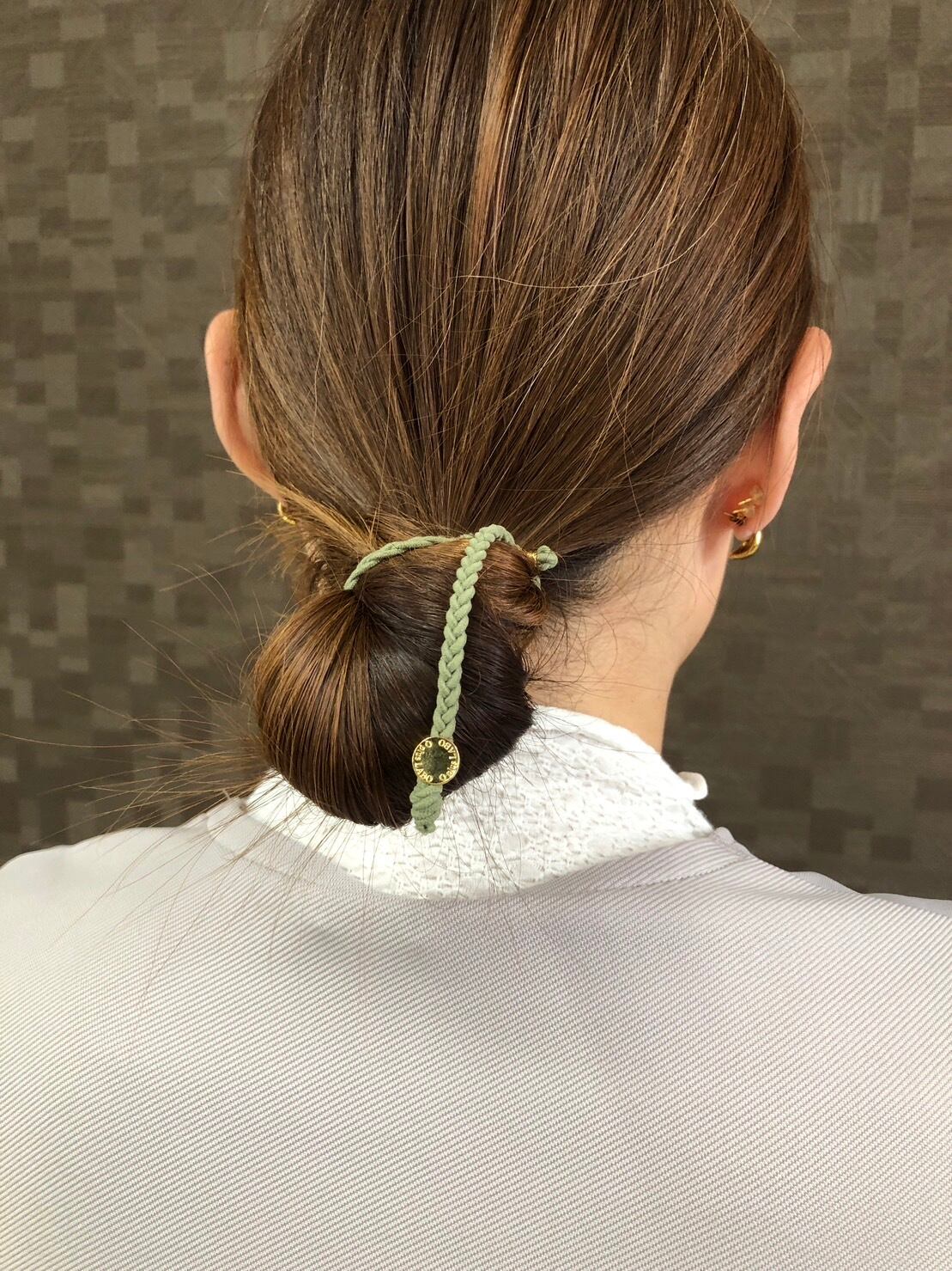 三つ編みの一本ゴムとオリジナルロゴのゴールド金具がアクセントになった、大人可愛いヘアアクセサリーの登場です。手首に巻いてアピールしたり、髪型をアレンジしてきゅっとまとめたり。オリーブカラー×ゴールドの組み合わせは、シンプルながら存在感があります。もちろん手作りで、当店だけのオリジナル。普段使いはもちろん、パーティーシーンでも活躍しますよ。このヘアアクセサリーがあなたのスタイルをより一層引き立てます。ぜひ手に取ってみてくださいね。
